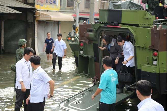 蔡英文25日搭云豹車到嘉義勘災遭嗆,后來她下車“撩水”勘災。