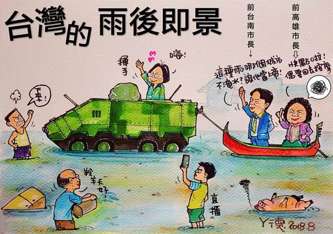 中國臺灣網8月28日訊 據臺灣“中時電子報”報道,823暴雨重擊南臺灣,多處水淹成災引發民怨。臺灣地區領導人蔡英文、臺當局“行政院長”賴清德的勘災行為,及“內政部長”徐國勇的發言引發許多爭議。對此,阿德漫畫在粉專上PO出諷刺漫畫創作,以蔡英文搭云豹裝甲車進入水災區勘災為主題,還找來賴清德、陳菊當配角暗諷時事。