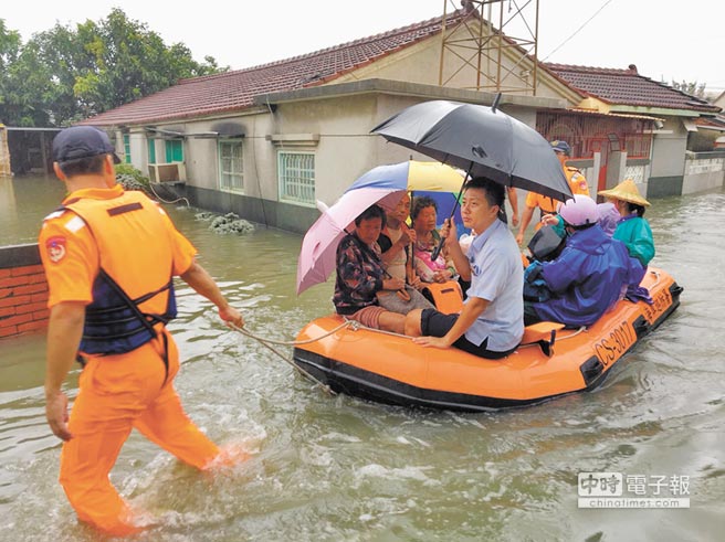 臺南北門區(qū)玉港里水淹過膝,多名高齡長者受困屋內(nèi)出不了門。(圖片來源:臺灣“中時電子報”)