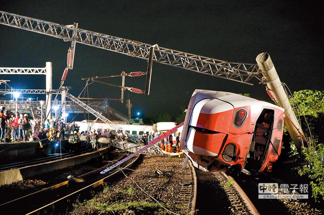 普悠瑪列車于新馬車站出軌,5個車廂翻覆,5、7、8節傾覆最嚴重,但臺鐵說普悠瑪經特檢沒問題。(圖片來源:臺灣“中時電子報”)