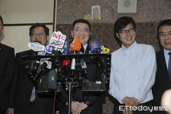 鄭文燦(右二)等人推舉卓榮泰(中)選民進(jìn)黨主席,引吳乃仁怒退黨。(圖片來源:臺(tái)灣“東森新聞云”)