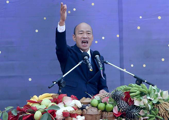 高雄市政府25日在愛河畔舉行“第三屆市長宣誓就職典禮”,新任高雄市長韓國瑜以詩人余光中的《讓春天從高雄出發》作為演說開場,參雜一小段英語演說,最后高喊“高雄來了”作為結尾。(圖片來源:臺灣“中時電子報”)