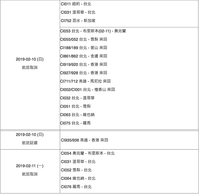 華航公布11日取消航班分別為CI031溫哥華-臺北、CI052悉尼-臺北、CI064維也納-臺北、CI076羅馬-臺北。下午新增的23航班分別為:CI601/602臺北-香港來回、CI915/916臺北-香港來回、CI923/924臺北-香港來回、CI278/279臺北-高松來回、CI188/189臺北-釜山來回、CI861/862臺北-金邊來回、AE991/992臺北-廈門來回、CI069/070臺北-倫敦(蓋威克)來回、CI523/524臺北-海口來回、CI063臺北-維也納、CI839/84高雄-曼谷來回、CI933/934高雄-香港來回。12日CI064維也納-臺北航班也遭取消。