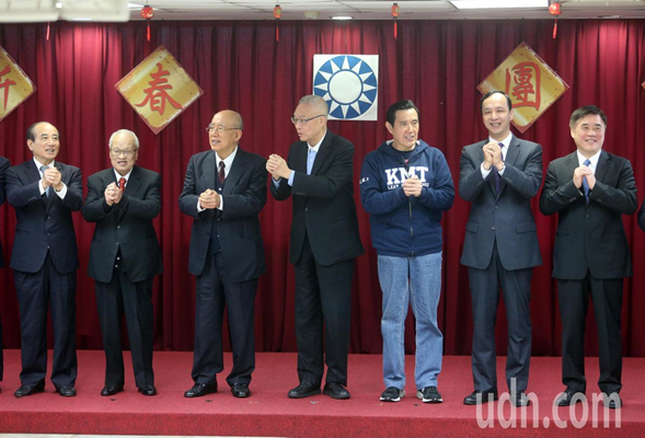 國(guó)民黨11日舉行新春團(tuán)拜,包括國(guó)民黨主席吳敦義(中)、前臺(tái)灣地區(qū)領(lǐng)導(dǎo)人馬英九(右三)、前新北市市長(zhǎng)朱立倫(右二)、前國(guó)民黨主席吳伯雄(左三)、前臺(tái)“立法院長(zhǎng)”王金平(左一)等一同出席,一起向黨內(nèi)同志拜年。(圖片來(lái)源:臺(tái)灣《聯(lián)合報(bào)》)