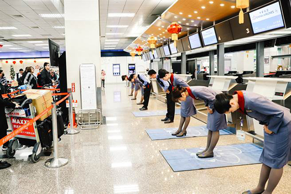 圖為臺灣松山機場華航柜臺,服務人員向旅客鞠躬敬禮。(圖片來源:臺灣“中時電子報”)