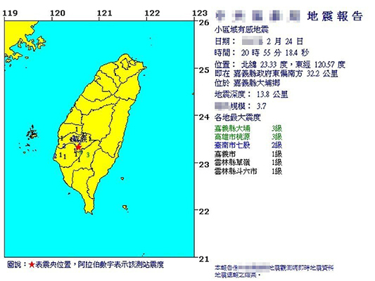 臺灣嘉義24日晚發生里氏規模3.7級地震