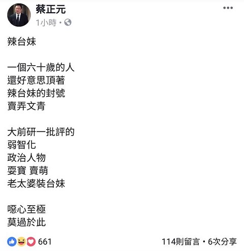 蔡正元近來(lái)頻頻發(fā)文,今日在臉書(shū)表示:“辣臺(tái)妹,一個(gè)六十歲的人,還好意思頂著,辣臺(tái)妹的封號(hào),賣弄文青。大前研一批評(píng)的,弱智化,政治人物。耍寶、賣萌,老太婆裝臺(tái)妹,惡心至極,莫過(guò)于此。”