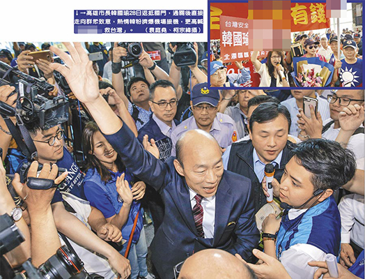 高雄市長韓國瑜28日返抵臺灣并向群眾揮手致意,熱情“韓粉”擠爆機場接機。(圖片來源:臺灣“中時電子報”)