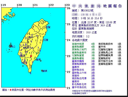 臺東今天上午9點(diǎn)56分發(fā)生里氏規(guī)模5.2級地震,震中在臺東縣政府西北方36.9公里,震源深度10公里。(圖片取自臺媒)