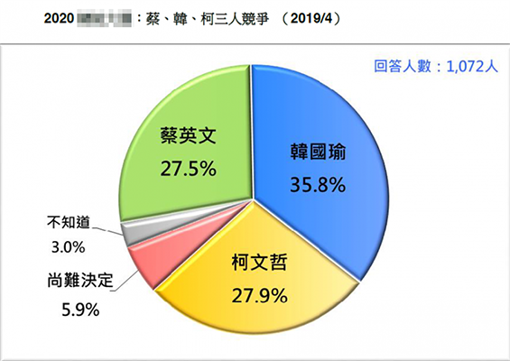 民進黨若由蔡英文披戰袍,韓國瑜將以35.8%的民調支持度一支獨秀,領先柯文哲的27.9%及蔡英文的27.5%。(圖片取自臺媒)