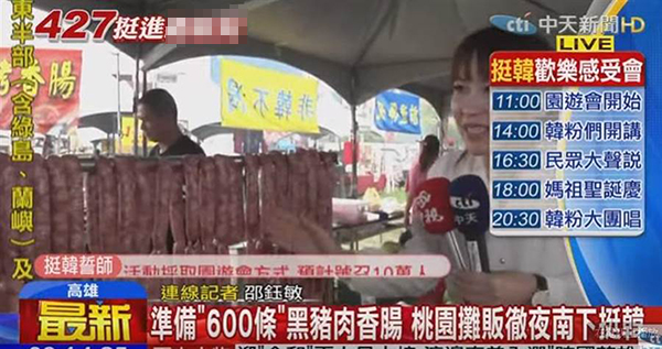 “韓粉”自發在鳳山舉辦市民感受聯誼歡樂大會,力挺高雄市長韓國瑜選臺灣地區領導人。現場再度攤商云集,民眾熟悉的“香腸瀑布”也沒缺席。(圖片取自臺媒)
