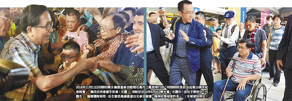 2018年11月11日陳水扁應邀參加晚間在高市三鳳宮舉行的紀念晚會,陳水扁向支持者握手致意(左圖)。相較于2016年6月4日陳水扁(右圖中)由兒子陳致中(右圖左)、醫療團隊陪同,從左營搭高鐵直達臺北參加餐會,精神狀態相差許多。(圖片來源:臺灣“中時電子報”)