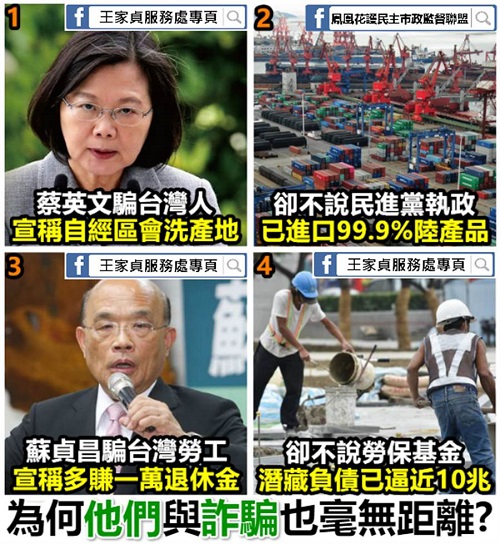 對此,“鳳凰花護民主市政監(jiān)督聯(lián)盟”則提及國民黨“立委”曾銘宗說,民進黨執(zhí)政早已進口99.9%大陸工業(yè)產(chǎn)品以及“行政院長”蘇貞昌稱勞工退休金增1萬(新臺幣,下同)打臉。該文寫道,蔡英文騙臺灣人,宣稱自貿(mào)區(qū)會洗產(chǎn)地,卻不說民進黨執(zhí)政已進口99.9%陸產(chǎn)品;蘇貞昌騙臺灣勞工,宣稱多賺一萬退休金,卻不說勞保基金潛藏負債已逼近10兆,“為何他們與詐騙也毫無距離?”