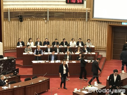 韓國瑜起身答詢時,民進黨籍議員集體離席(圖片來源:臺灣“東森新聞云”)