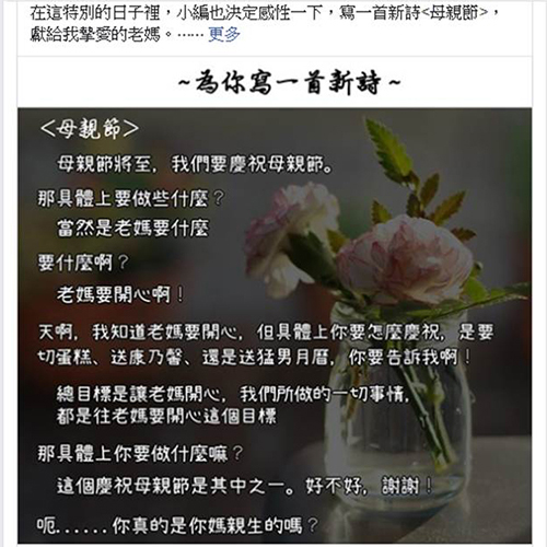 “內(nèi)政部”昨日為慶祝母親節(jié),臉譜網(wǎng)粉絲團(tuán)小編特地發(fā)出新詩慶祝,全文如下:母親節(jié)將至,我們要慶祝母親節(jié)。那具體上要做些什么?當(dāng)然是老媽要什么。要什么啊?老媽要開心!天啊,我知道老媽要開心,但具體上你要怎么慶祝,是要切蛋糕、送康乃馨,還是送猛男月歷,你要告訴我啊!總目標(biāo)是讓老媽開心,我們所做的一切事情,都是往老媽要開心這個目標(biāo)。那具體上你要做什么嘛?這個慶祝母親節(jié)是其中之一。好不好,謝謝!呃……你真的是你媽親生的嗎?