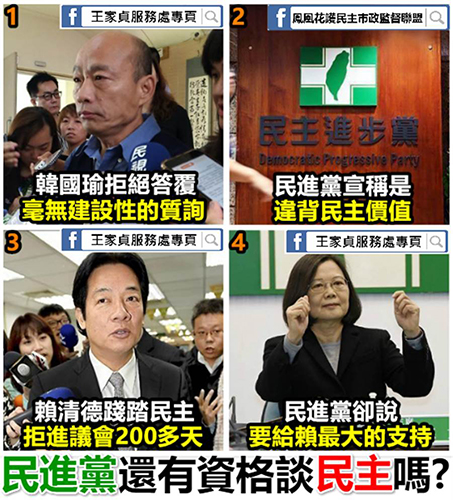 韓國瑜拒答無建設(shè)性的質(zhì)詢被指違背民主價值,臉譜網(wǎng)網(wǎng)友則拿賴清德當臺南市長時不進議會一事諷刺。(圖片取自臺媒)