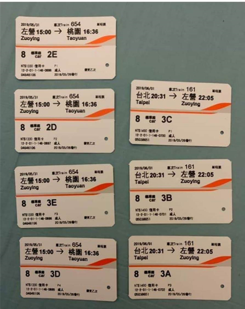 網友在臉譜網(Facebook)社團“韓國瑜后援會”發文,秀出整整兩排共7張左營至桃園的高鐵車票,寫道:5月31日先上桃園機場附近旅館住一天,6月1號送小女兒念書,跟老婆、大女兒直奔臺北凱達格蘭大道、風雨無阻!