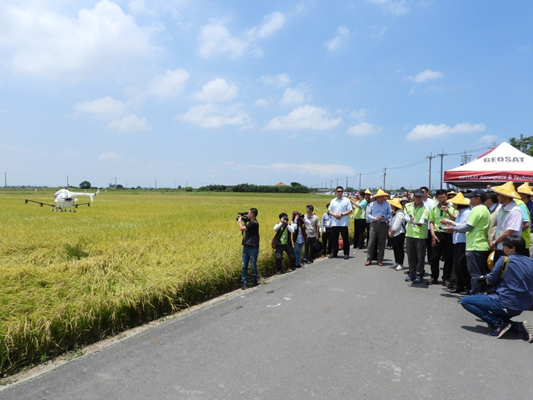 蔡英文今(31日)到芳榮米廠參訪,參觀一旁稻田無人機噴灑農(nóng)藥作業(yè)過程,隨后與在地農(nóng)民與地方人士座談。(圖片來源:臺灣“中時電子報”)