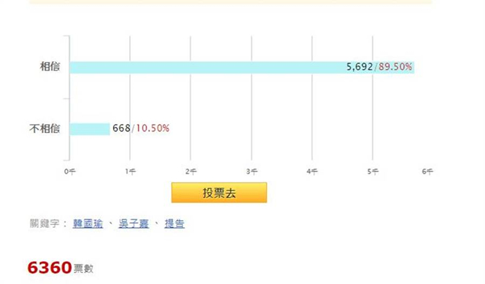 對此,臺灣《中時電子報》昨舉行網絡投票,詢問網友“你是否相信韓國瑜的清白?”至今日上午七點止有達約9成的網友相信韓國瑜,僅1成的票數不相信。