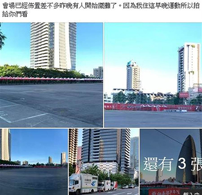 網友發文,韓國瑜臺中造勢會場已經布置差不多,昨晚有人開始擺攤了。(圖片取自臺媒)