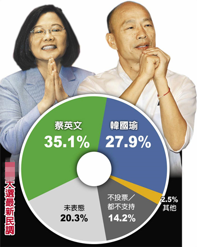 最新民調(diào):韓國瑜民調(diào)觸底反彈 與蔡英文差距縮至7.2%