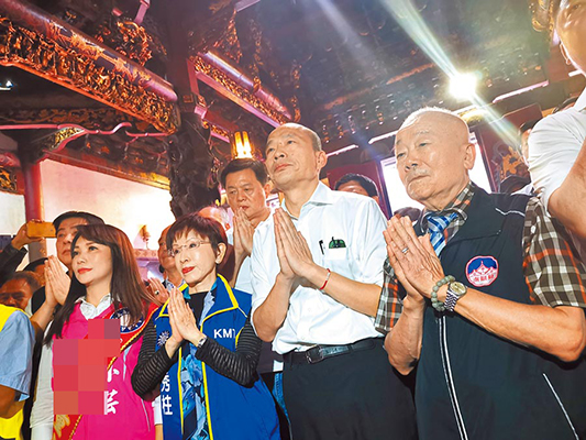韓國瑜(右二)19日到北門南鯤鯓代天府參拜,呼吁民眾為子孫未來,票投國民黨。(圖片來源:臺灣“中時電子報”)