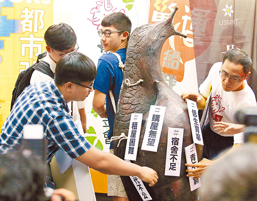 年輕人背負蝸牛殼,凸顯高房價壓力。(圖片來源:臺灣“中時電子報”)