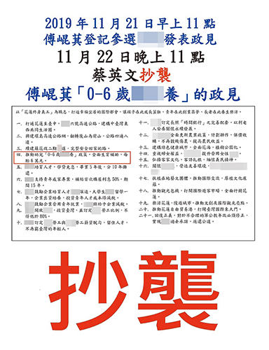 有網友揪出蔡英文抄襲傅昆萁參選“立委”的幼兒政見,制作圖卡,有圖為證。(圖片取自臺媒)