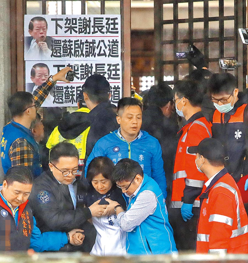 多位國民黨“立委”與市議員6日赴臺當(dāng)局“外交部”抗議,警衛(wèi)關(guān)起大門阻擋進(jìn)入,推擠之下“藍(lán)委”林奕華(下中)受傷,被護(hù)送送醫(yī)。(圖片來源:臺灣《中國時報》)