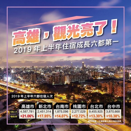 從韓國(guó)瑜拿出“交通部觀光局”臺(tái)灣旅宿網(wǎng)的數(shù)據(jù)可以看出,高雄市在2019年上半年住宿人次高達(dá)458萬(wàn)7781人,成長(zhǎng)率21.06%,名列“六都”第一。新北市住宿人次達(dá)245萬(wàn)1314人,成長(zhǎng)率17.95%,位居第二。臺(tái)南市住宿人次為187萬(wàn)5096人,成長(zhǎng)率14.07%,排名第三。(中國(guó)臺(tái)灣網(wǎng) 王琳)