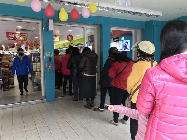 宜蘭市某連鎖藥妝店涌入大量搶購口罩的民眾,排成的隊(duì)伍從店內(nèi)拉到店外的馬路上。(圖片來源:臺灣“中時(shí)電子報(bào)”)