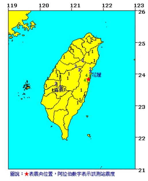 16日4時13分發生3.7級地震,地震深度8.4公里,震中位于花蓮縣政府南偏西方19.5公里(位于花蓮縣壽豐鄉),最大震度花蓮縣4級。