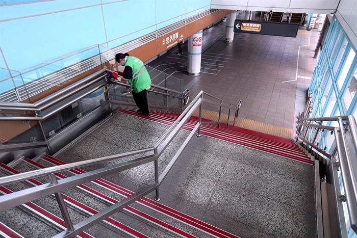 16日下午2時的臺北地鐵文湖線忠孝復興站僅零星民眾搭乘,清潔人員正在消毒樓梯扶手。(圖片來源:臺灣“中時新聞網”)