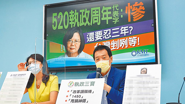 民進黨當局連任后,從去年開放“萊豬”、關閉中天新聞臺,到今年臺鐵太魯閣號事故、興達電廠接連跳電、疫情嚴峻疫苗數(shù)量卻不足等,引發(fā)臺灣民怨沸騰。國民黨中央昨日盤整民進黨當局這一年來施政表現(xiàn),直指“缺水、缺電、缺疫苗、黑道執(zhí)政、食安破功”已成為民進黨施政最鮮明的印象。