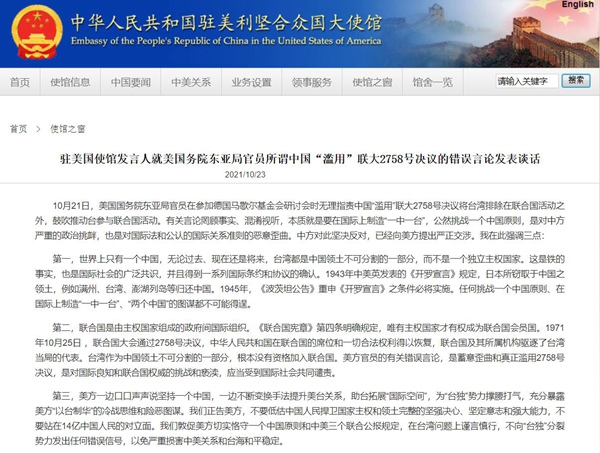 中國臺灣網10月23日訊 中國駐美國使館發言人23日就美國務院東亞局官員所謂中國“濫用”聯大2758號決議的錯誤言論發表談話。發言人表示,10月21日,美國國務院東亞局官員在參加德國馬歇爾基金會研討會時無理指責中國“濫用”聯大2758號決議將臺灣排除在聯合國活動之外,鼓吹推動臺參與聯合國活動。有關言論罔顧事實、混淆視聽,本質就是要在國際上制造“一中一臺”,公然挑戰一個中國原則,是對中方嚴重的政治挑釁,也是對國際法和公認的國際關系準則的惡意歪曲。中方對此堅決反對,已經向美方提出嚴正交涉。