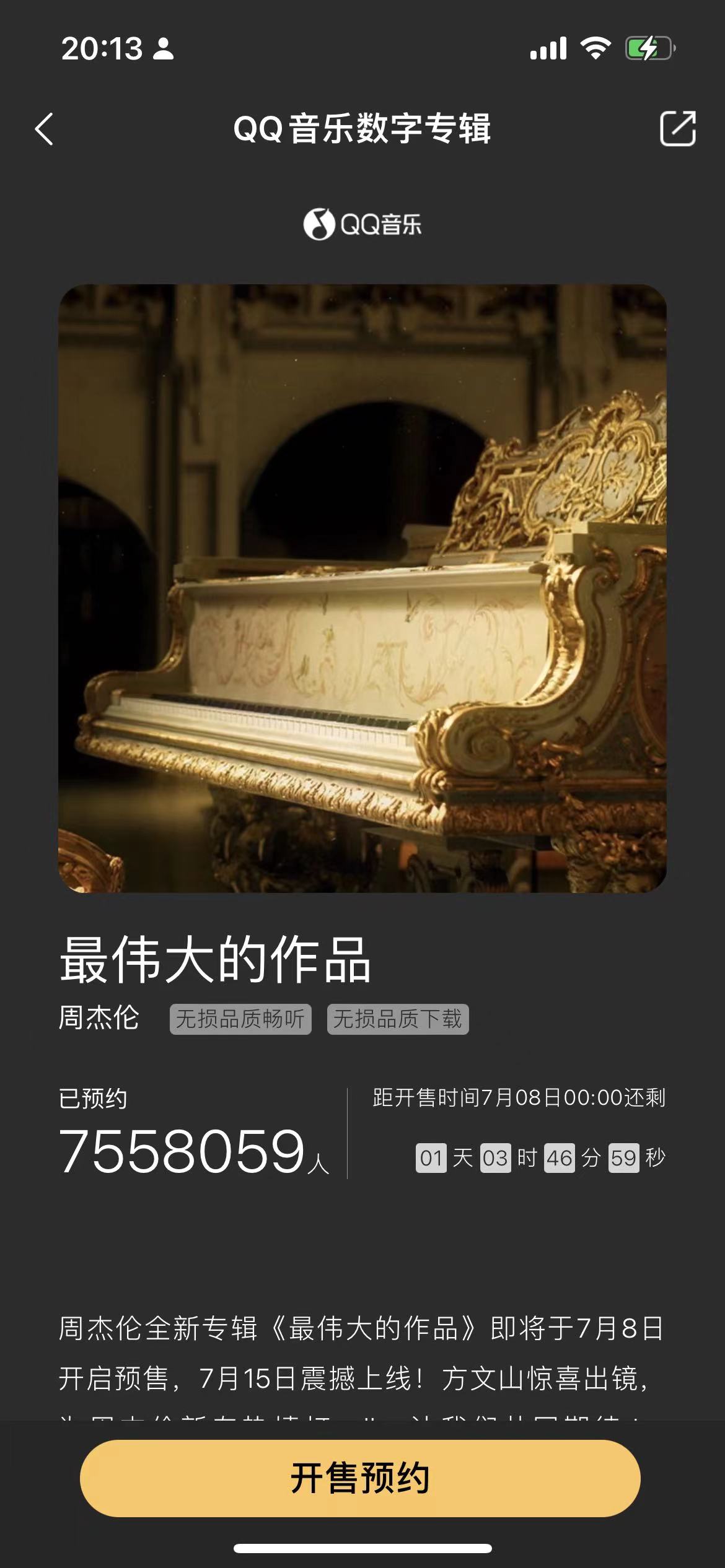 據(jù)QQ音樂顯示,周杰倫第15張專輯《最偉大的作品》先行曲MV將于7月6日中午12時(shí)首播上線。《最偉大的作品》數(shù)字專輯預(yù)約現(xiàn)已開啟,截至7月6日20時(shí),預(yù)約人數(shù)超755萬(wàn)人次,將于7月8日開啟預(yù)售,7月15日上線。