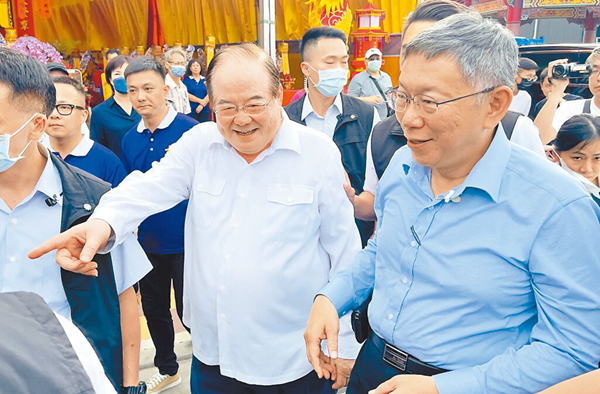 民眾黨主席柯文哲(右)12日到三重先嗇宮參拜,董事長李乾龍(左)親自接待。(圖片來源:臺灣“中時新聞網(wǎng)”)