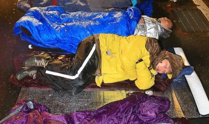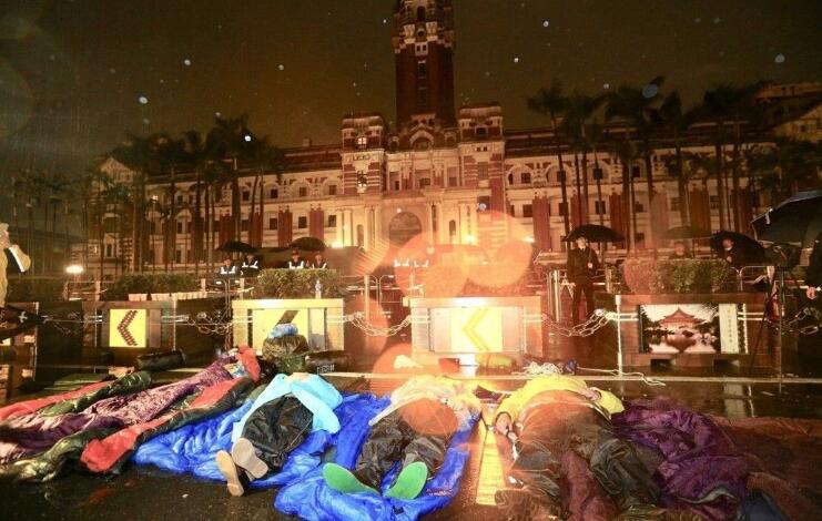 在禁食行動實施超過24小時后,6日晚間6時50分“時代力量”五位“立委”又利用雷射投影器材將熒光綠色的“退回勞基法”五個字投影到蔡辦外墻上,宣示反對勞基法再修法的決心;不久后這出“小綠”尬“大綠”的戲就到了高潮的一幕——7日凌晨約0點10分,因不滿第二頂帳篷遭警方強行拆除并“代為保管”,“時代力量”的黃國昌與徐永明等5名“立委”憤而直接躺在雨中睡覺!