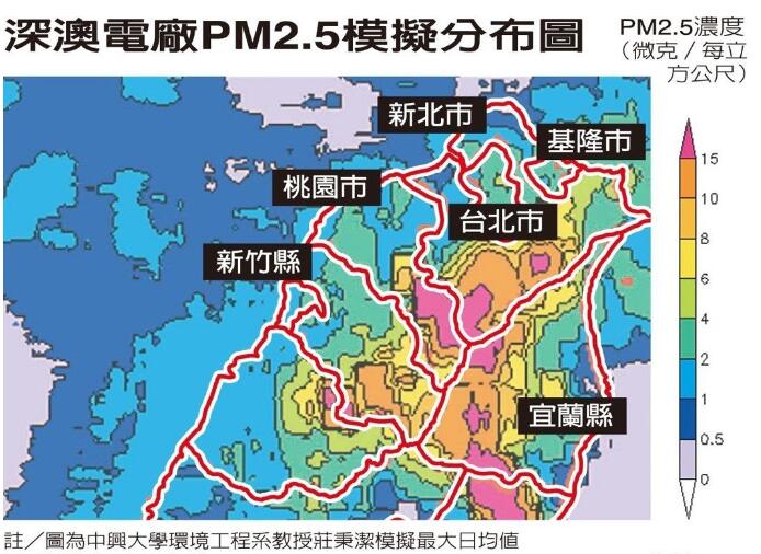 莊秉潔的模擬結果指明,深澳電廠PM2.5日平均增量高達6.075μg/m3,此數據可是臺電環境差異分析報告書中模擬值1.933的3倍以上,且宜蘭縣及桃園市的污染量日平均增量居然比新北市還高!