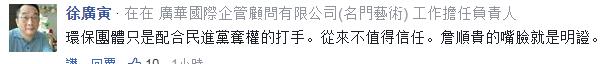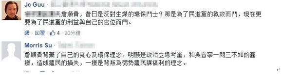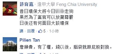 上了臺就變了臉,當了官就黑了心!火眼金睛的臺灣網友們一語道出真相,“所謂‘環保斗士’,當初是為民進黨執政而斗,如今是為了民進黨利益與自己的官位而斗”、“詹順貴有了錢權之后,腦袋和屁股就對換了”。