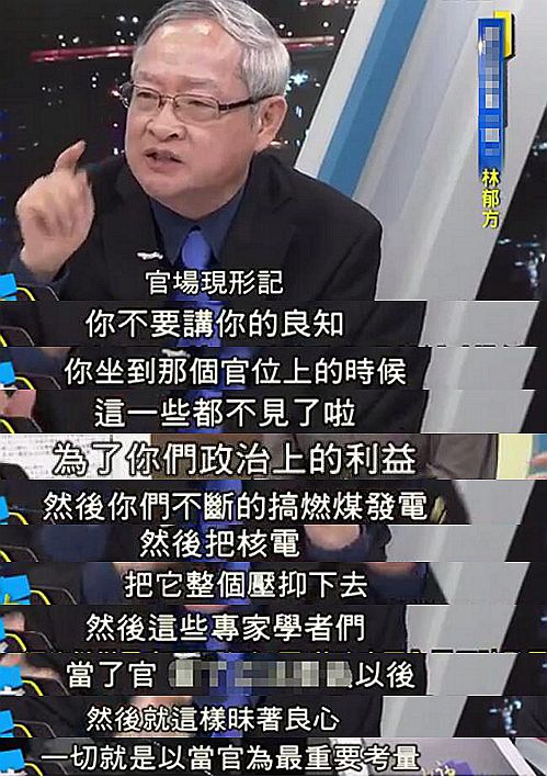 前“立委”林郁方更痛心疾首的表示,他看到了現實版的“官場現形記”,痛批蔡英文當局“為了政治上的利益”不斷靠燃煤發電;林也狠戳臺灣所謂專家、學者的脊梁骨,“當了官以后就昧著良心,一切以當官為最重要考量”!