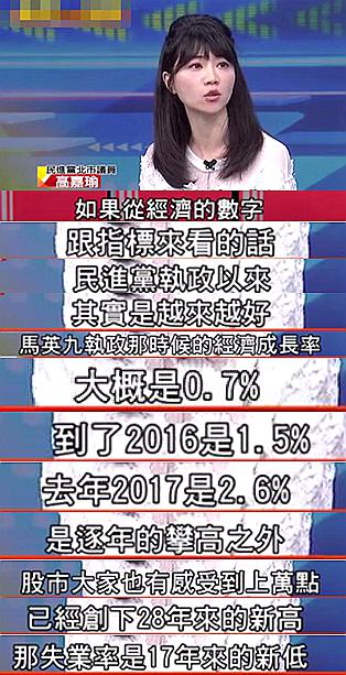 來看看這位民進黨議員是如何為“鐵票倉跳票”作解釋的吧:民進黨曾批判馬英九是“數字治臺”,而這個綠營小姐姐一上來就先祭出“數字陣”,說從經濟指數上看,民進黨與馬英九執政時期好很多了啊;之后拿出“甩鍋招”,說飯店倒閉有很多方面的原因啊,店家不要都怪到民進黨身上,你們自己也要轉型;接著開始“數政績”,說陸客雖然不來了,但日本和東南亞客人有增加啊,而且像臺中市長林佳龍之類的也有積極的幫地方在招商啊;最后搬出“誠懇臉”,表示雖然民進黨做了很多“復興經濟”的事,但若人民感受不到,那蔡當局也會“好好檢討”……