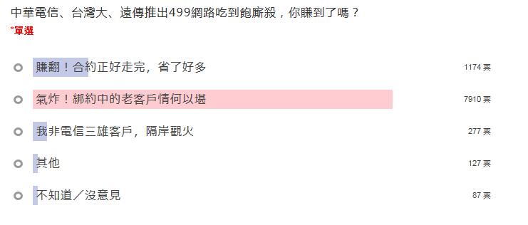 臺灣電信三雄(中華電信、臺灣大哥大和遠傳電信)近期推出“499(新臺幣,下同)網絡吃到飽”的7天限時優惠方案,引全臺民眾陷入搶辦狂潮,許多民眾不惜付違約金也要辦。