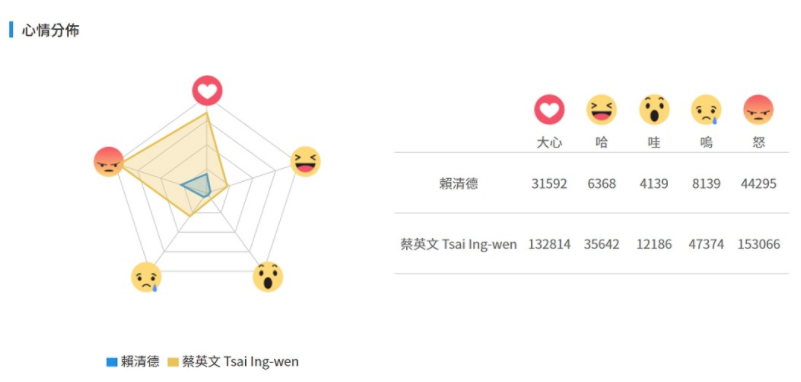 臺(tái)媒通過調(diào)查蔡英文、賴清德臉譜網(wǎng)發(fā)現(xiàn),這一年內(nèi)(20170510—20180510)跟進(jìn)兩人話題并給予按鈕回應(yīng)的網(wǎng)友當(dāng)中,排除按“贊”的人次,按下心情按鈕的人則以“怒”最多,接著才是愛心,表示對(duì)他們的言論感到不滿的人是極多數(shù)。