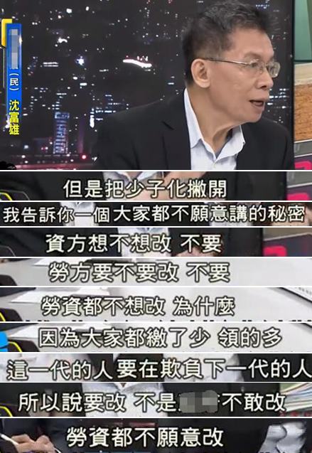 沈富雄指出,勞保年金受少子化影響,若照現行制度來看,將來的欠債是2位數以上的、以兆為單位的新臺幣。他還強調,現在臺灣45歲以下勞工繳的錢,其實都是為退休老人家準備的,為此也建議55歲以上的勞工可以加減繳費,55歲以下不要交,“我帶你們去革命”。
