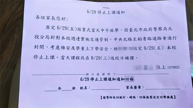 29日,臺灣地區(qū)領導人蔡英文出席“三軍六校聯(lián)合畢業(yè)典禮”,鄰近的文化小學一度被迫停課,一名家長在臉譜網(wǎng)曝出《停課通知單》,并發(fā)文抱怨道:“真的假的公文?‘三軍六校畢業(yè)典禮’是什么大事,到底哪位天王要去,搞到如此這般大規(guī)模管制,連小學生都停課,要不要頒布戒嚴令?”
