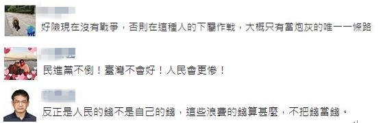 對此,臺灣網友憤怒道:“好險現在沒有戰爭,否則在這種人的下屬作戰,大概只有當炮灰唯一一條路”“民進黨不倒!臺灣不會好!人民會更慘”“反正是人民的錢不是自己的錢,這些浪費的錢算什么,不把錢當錢”。