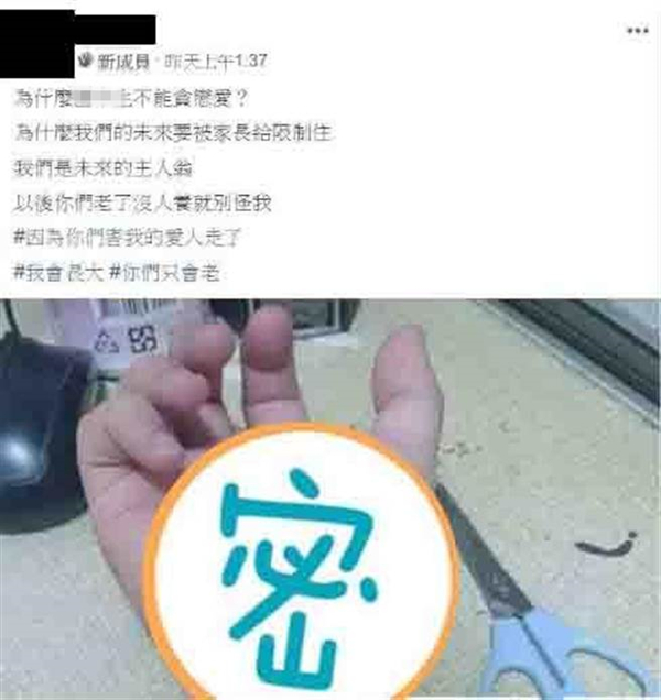 暑假才剛開始沒幾天,就有學生脫序事件頻傳。4日,有網友在臉譜網上發現,一名初中生PO出“割腕照”,內容是他疑似在父母的壓力下,被逼和女友分手,并寫下“為什么初中生不能談戀愛?為什么我們的未來要被家長給限制住?我們是未來的主人翁,以后你們老了沒人養就別怪我!”最后更嗆出“我會長大,你們只會老。”