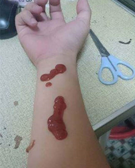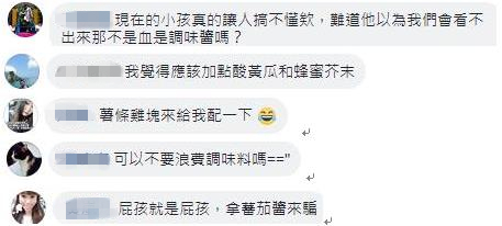 但照片中,明顯可以看出手腕上的并不是鮮血,而是西紅柿醬,讓其他網友看了紛紛笑回,“現在的小孩真的讓人搞不懂,難道他以為我們會看不出來那不是血是調味醬嗎”“薯條雞塊來給我配一下”“屁孩就是屁孩,拿西紅柿醬來騙”。