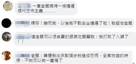 對此,網友吐槽道: “一只老鼠搞垮一條捷運” “嚇死了,以后不敢去坐捷運啦”;還有網友調侃道:“這老鼠可以很自豪的跟其他鼠輩說我打敗人類了”“老鼠說我出來散個步就造成恐慌,全家旅游的時候不就可以統一臺灣了”。